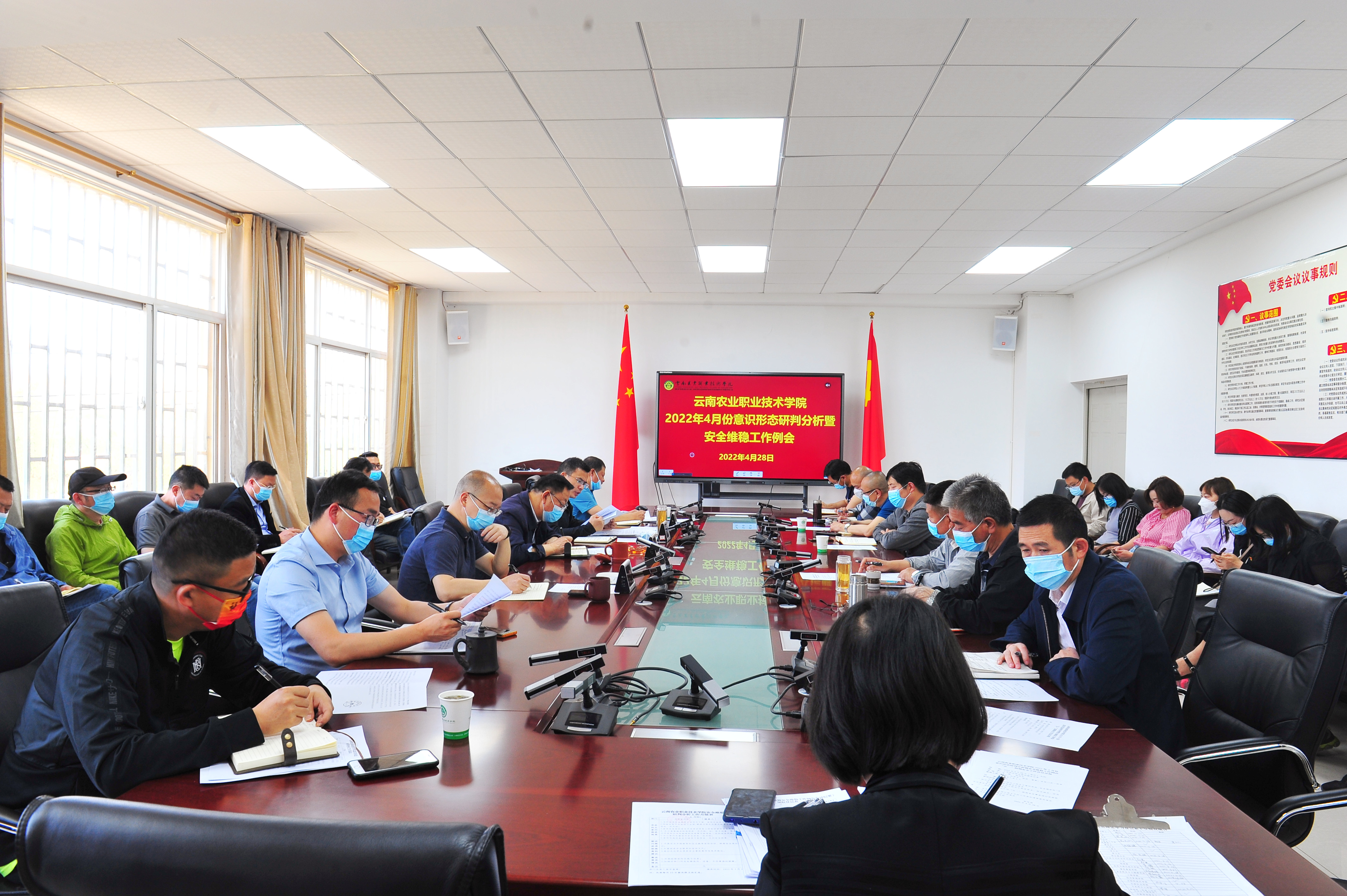 意识形态4月28日上午,学院在小哨校区综合楼四楼会议室召开2022年4月份意识形态研判分析暨安全维稳工作例会和“五一”假期安全工作会议,党委副书记、院长文俊;党委副书记伍学龙、副院长杨波出席会议,各相关职能部门、各二级学院主要负责人参加会议,会议由副院长雷衡主持。