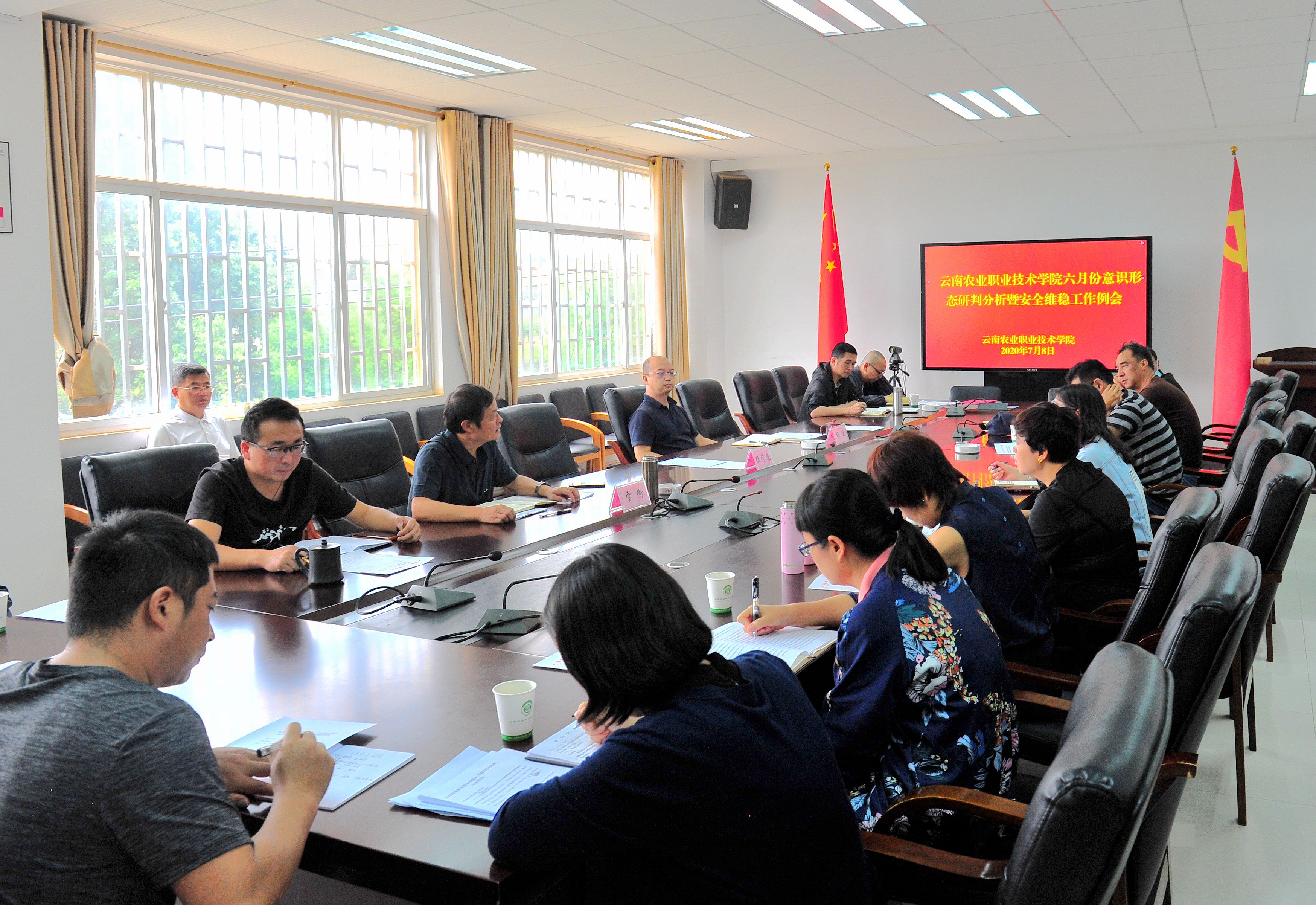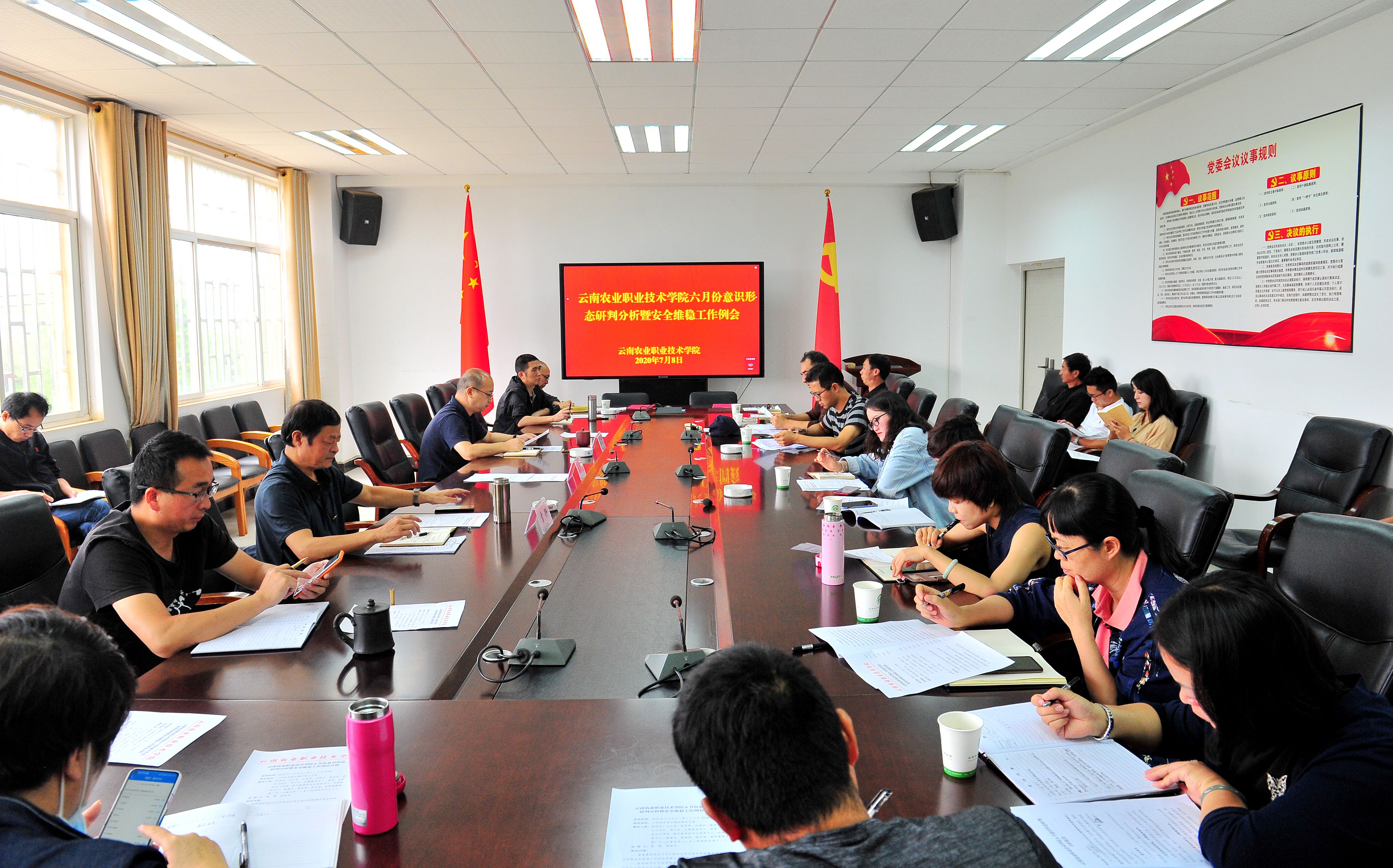 意识形态7月8日上午,我院在小哨校区综合楼四楼会议室举行6月份意识形态研判分析暨安全维稳工作例会,贯彻落实中央、省委及上级部门关于意识形态和安全稳定工作的部署要求,并对下一阶段工作进行安排。副院长杨波、雷衡出席会议,学院相关部门负责人参加会议。会议由雷衡副院长主持。
