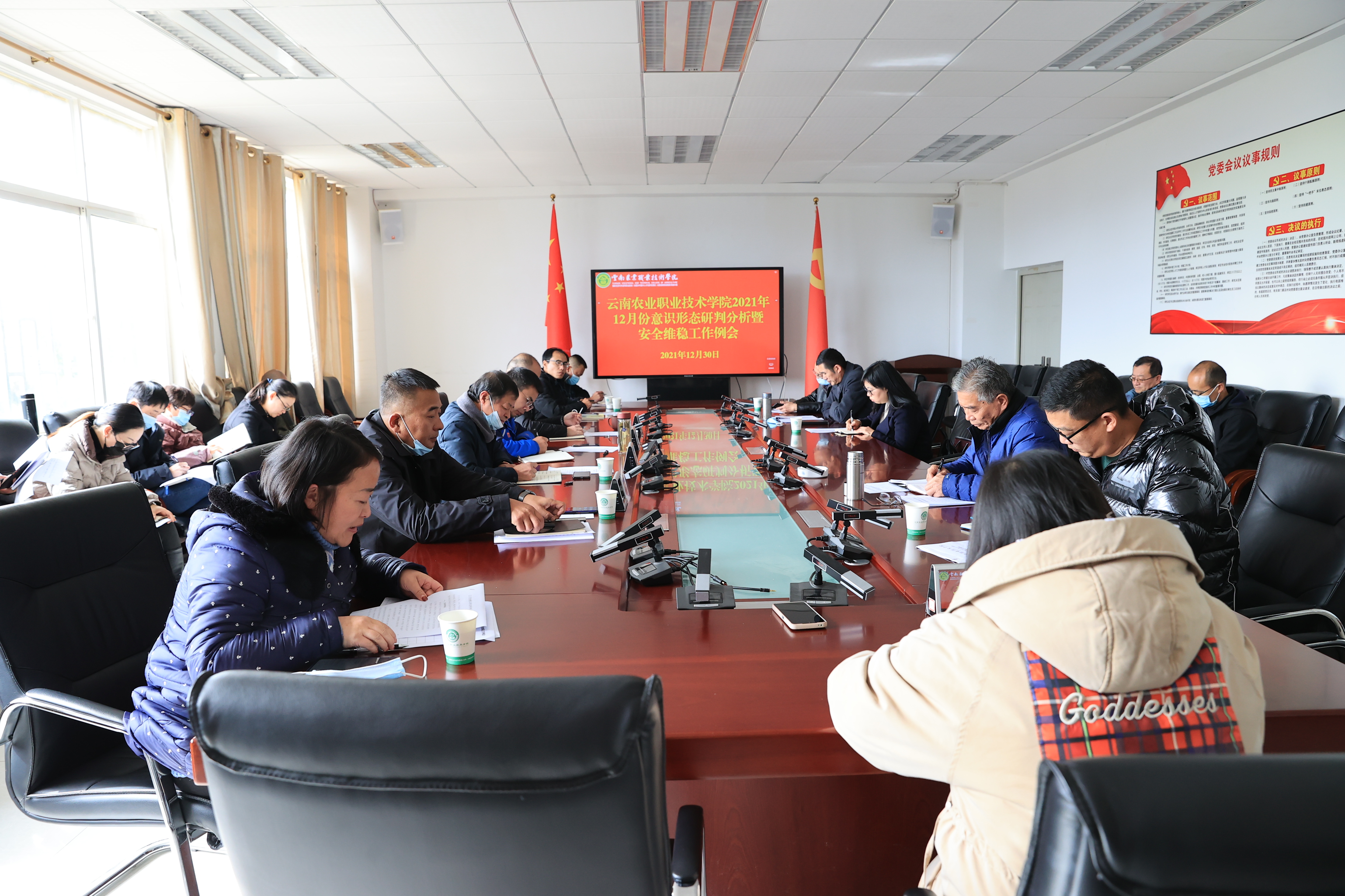 12月30日下午,学院在小哨校区综合楼四楼会议室召开12月份意识形态研判分析暨安全维稳工作例会,总结12月以来学院意识形态领域和安全稳定情况,汇报疫情防控工作进展,安排部署下一阶段工作。党委副书记伍学龙、副院长杨波和副院长苏华伟出席会议,学院各有关部门负责人参加会议,会议由副院长雷衡主持。