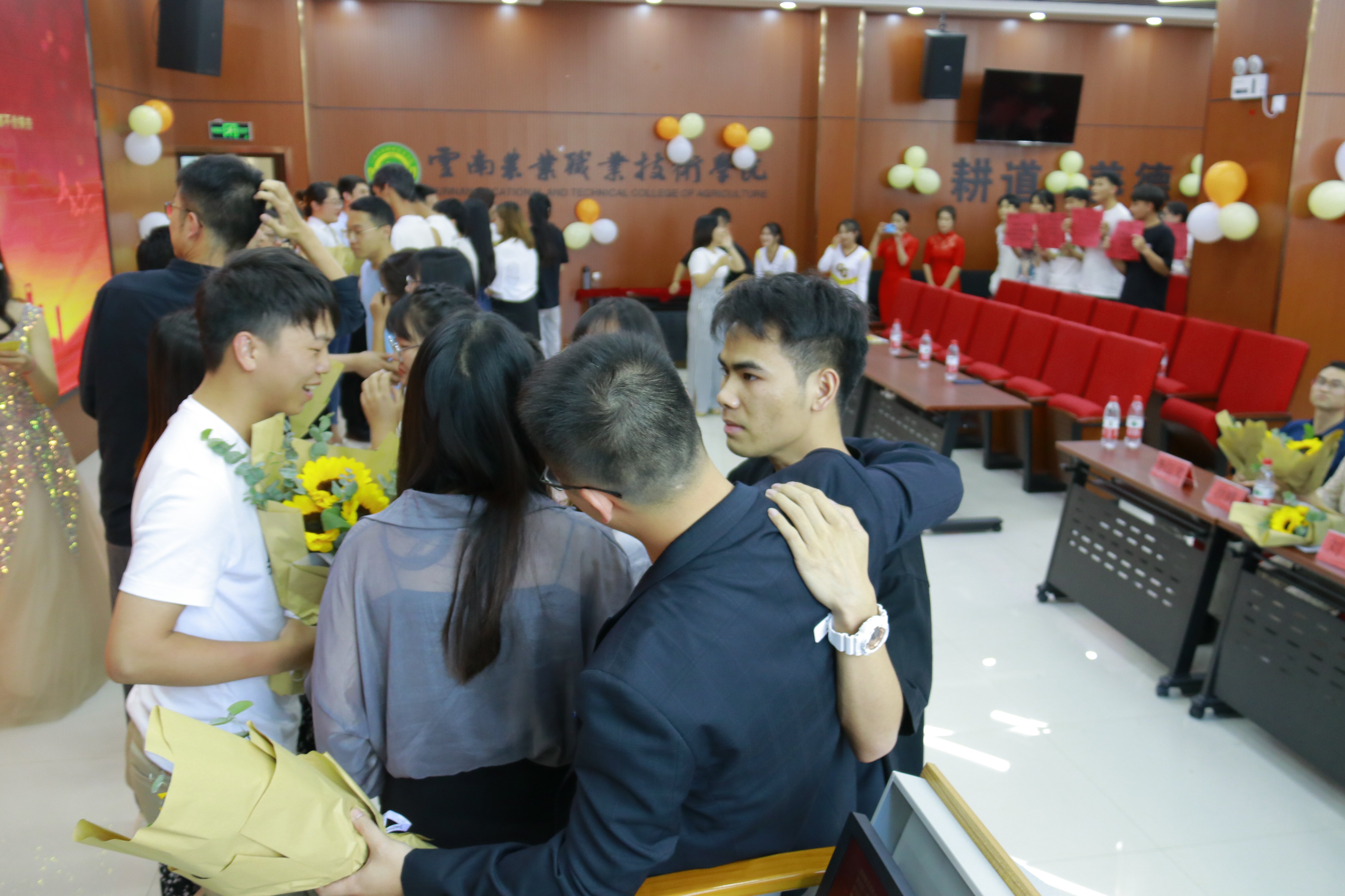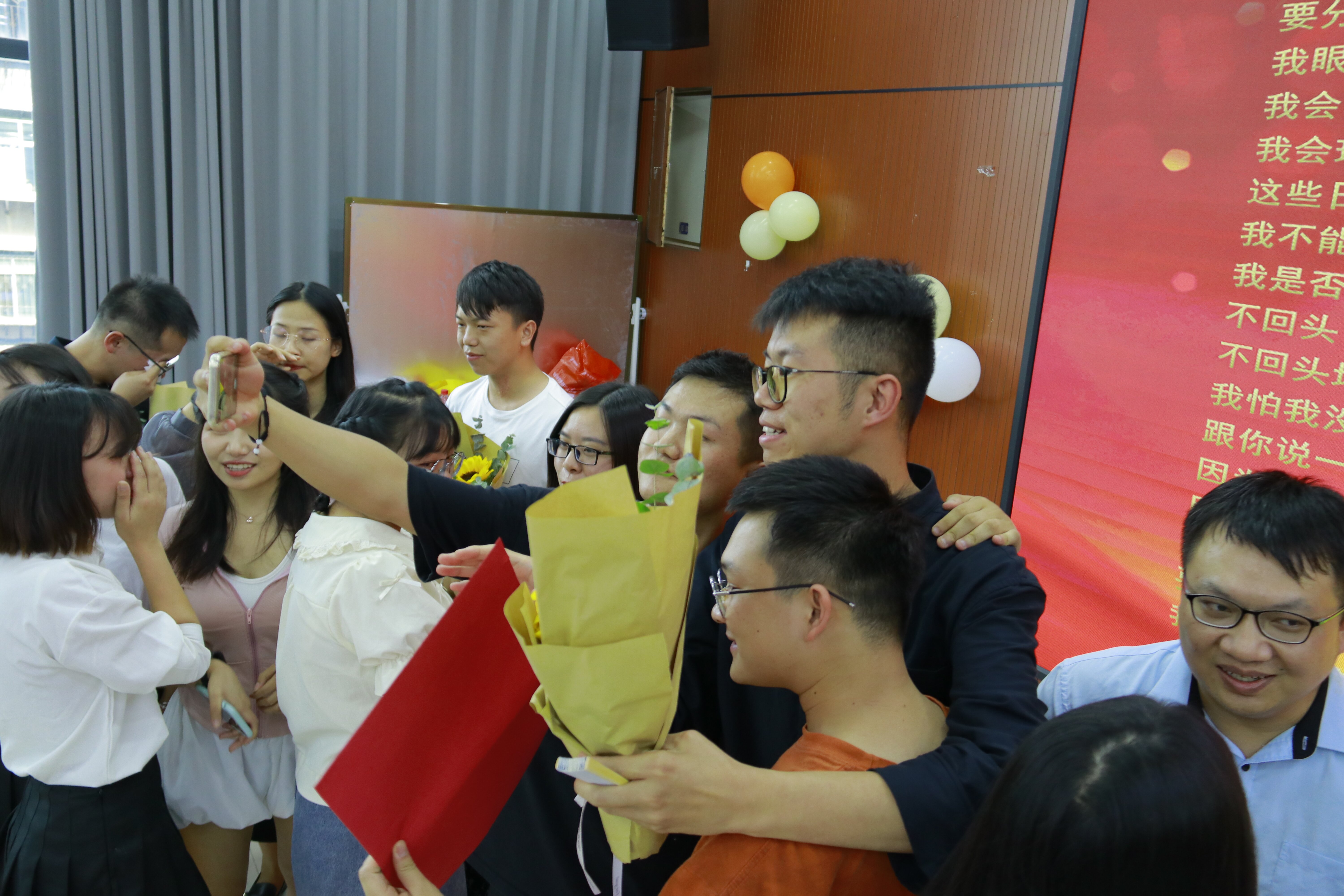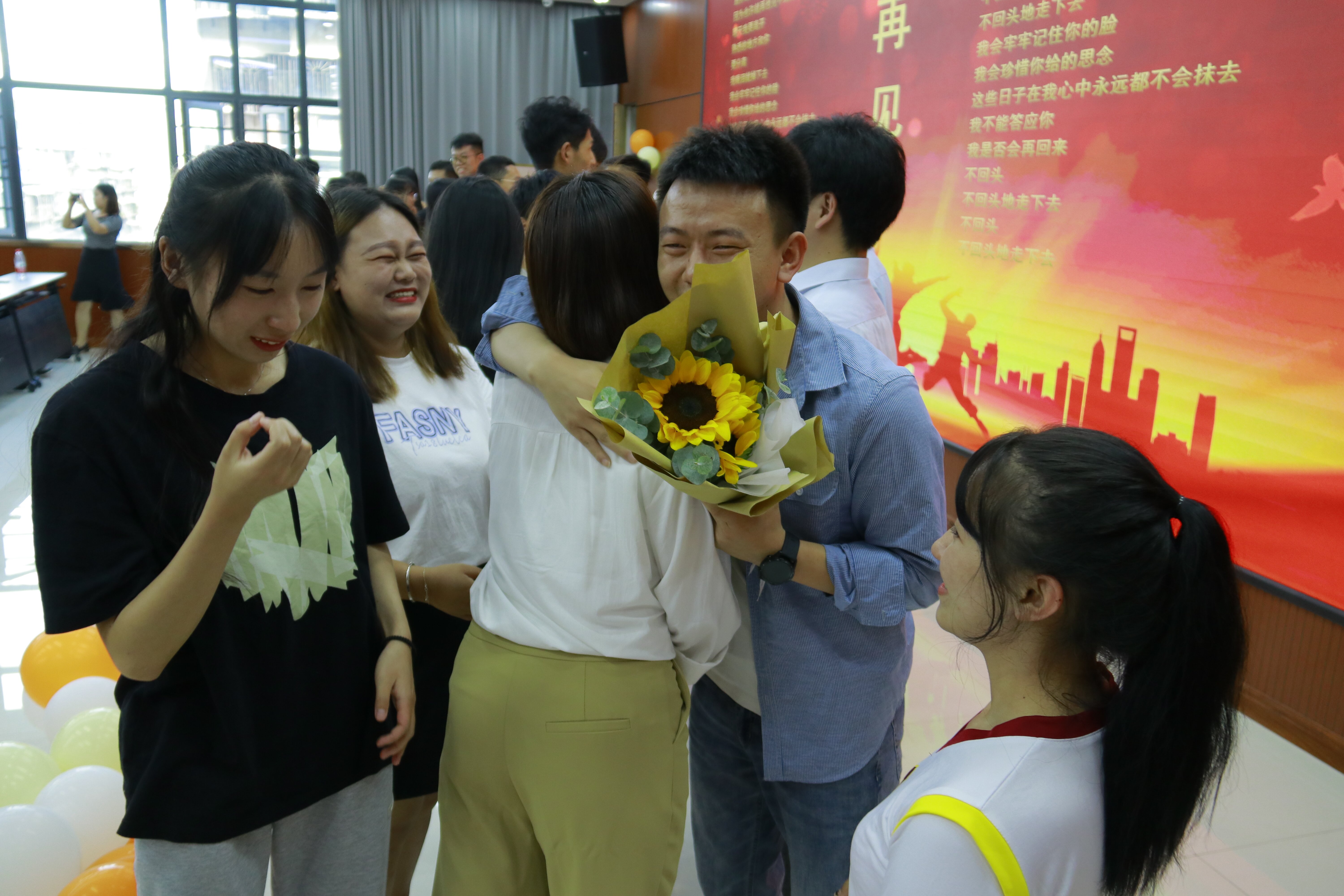 老师们纷纷上台为学生送上临别祝福表达对学生的祝福和期待,老师真情流露,几度哽咽,淋漓尽致地展现了师生间深厚情谊,这份不舍的情怀感染了场下的每位同学,纷纷上台赠送鲜花,拥抱老师。现场氛围真实、感人,一首《再见》更将整个活动推向了高潮。