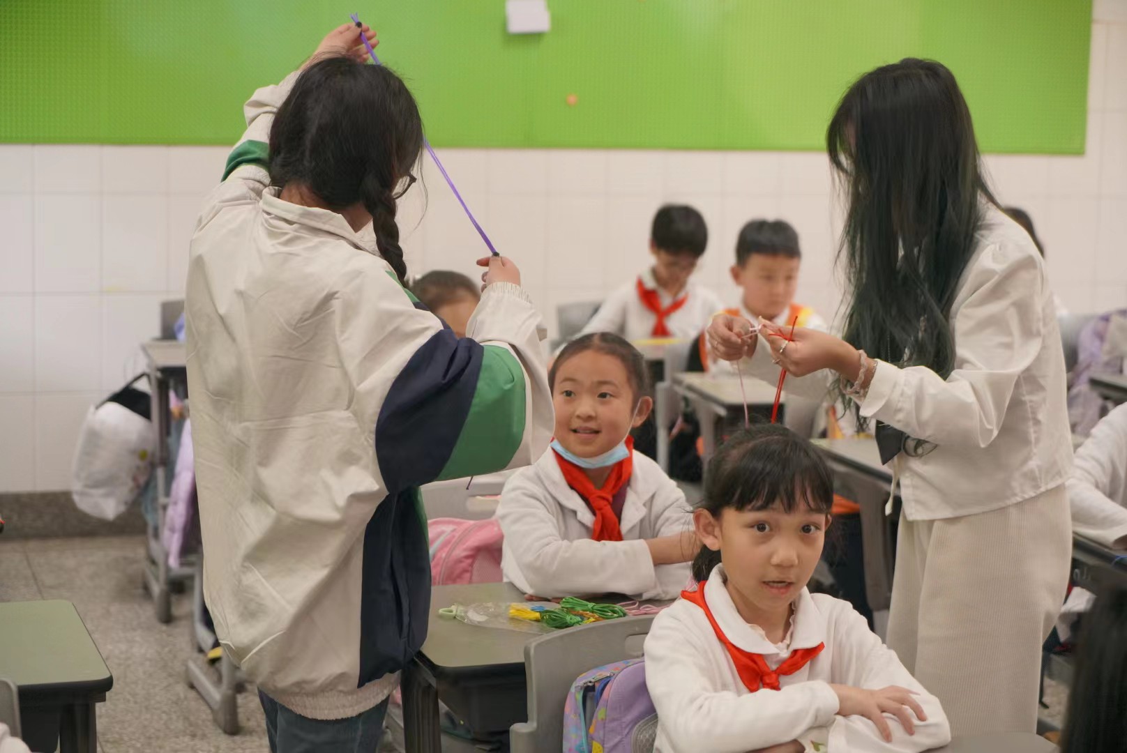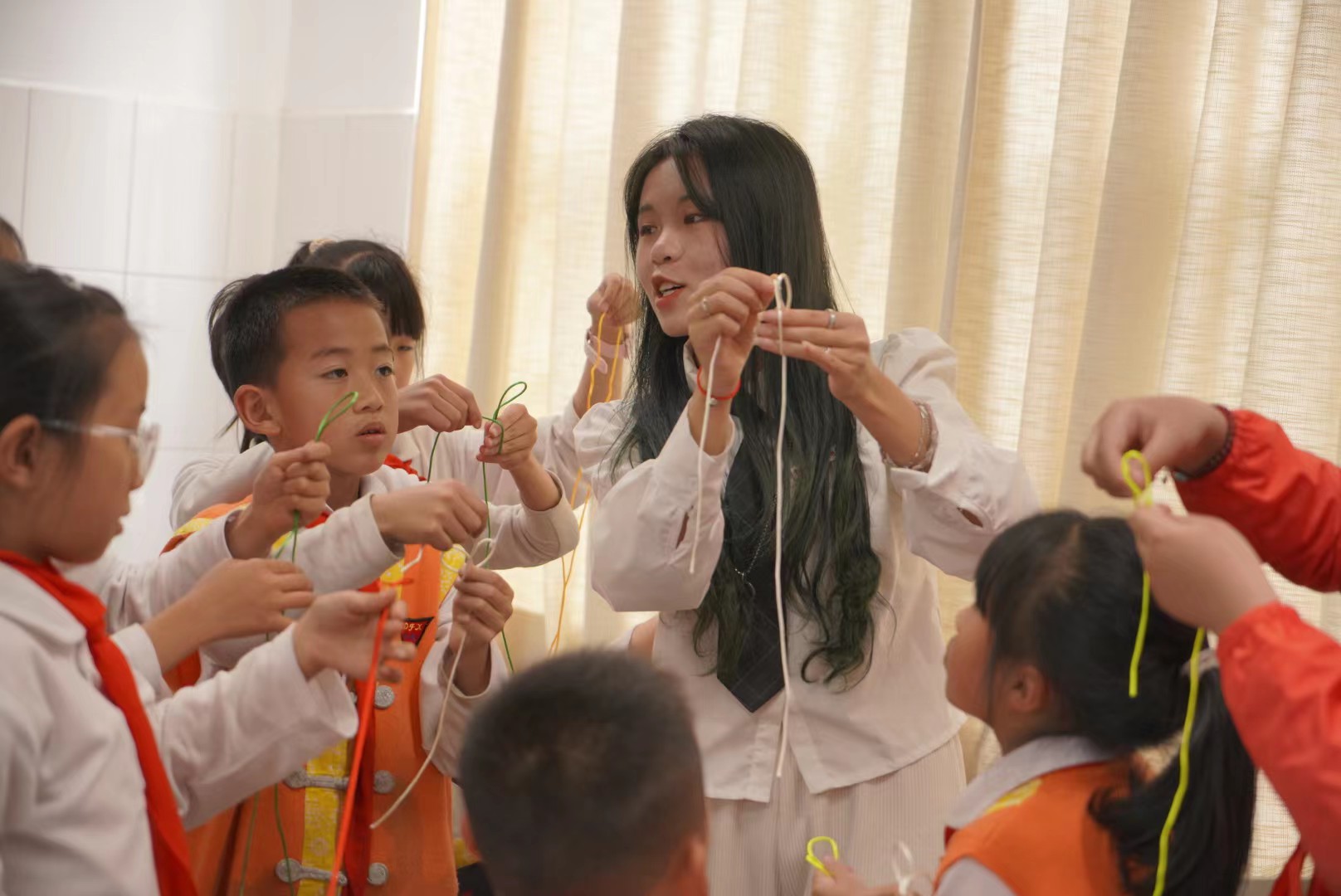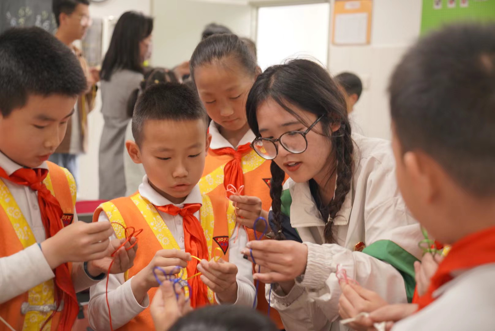 学院杨文涛老师作题为《农耕文化与耕读教育》的专题讲座。讲座后,志愿者们将裁剪好的丝线进行分发,通过投影的方式先进行一次编制展示,以便于小朋友们的观看编制步骤,随后组织开展实际操作教学,当小朋友们在编制过程中遇见难点时,志愿者及时进行指导协助。