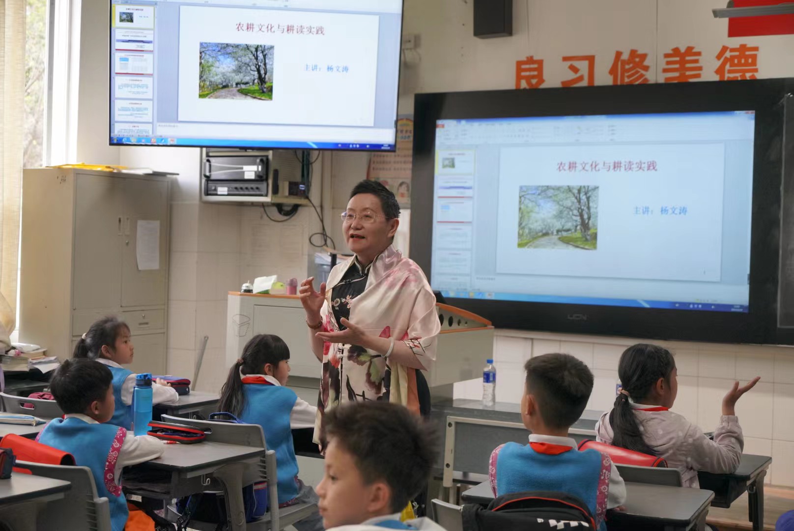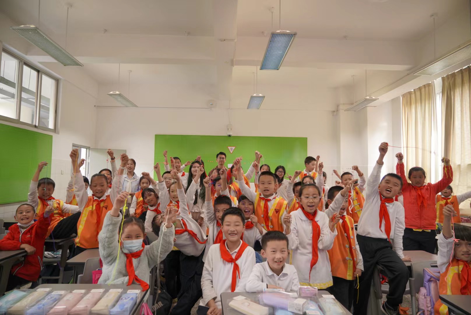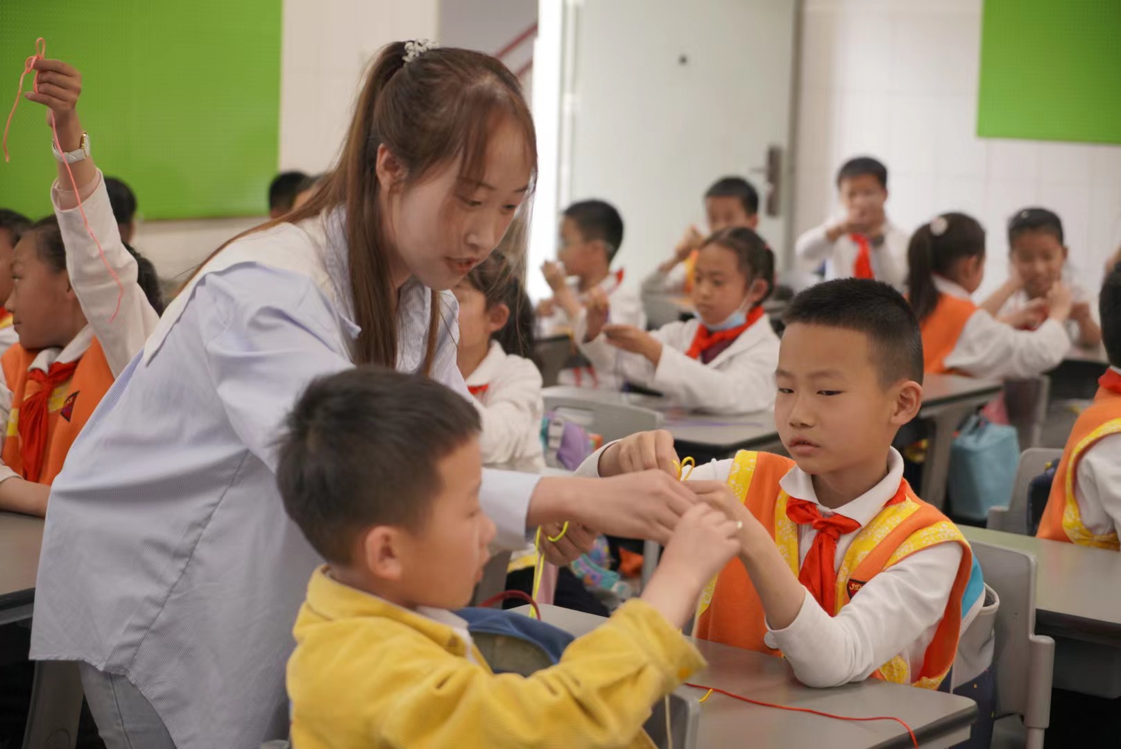 学院杨文涛老师作题为《农耕文化与耕读教育》的专题讲座。讲座后,志愿者们将裁剪好的丝线进行分发,通过投影的方式先进行一次编制展示,以便于小朋友们的观看编制步骤,随后组织开展实际操作教学,当小朋友们在编制过程中遇见难点时,志愿者及时进行指导协助。