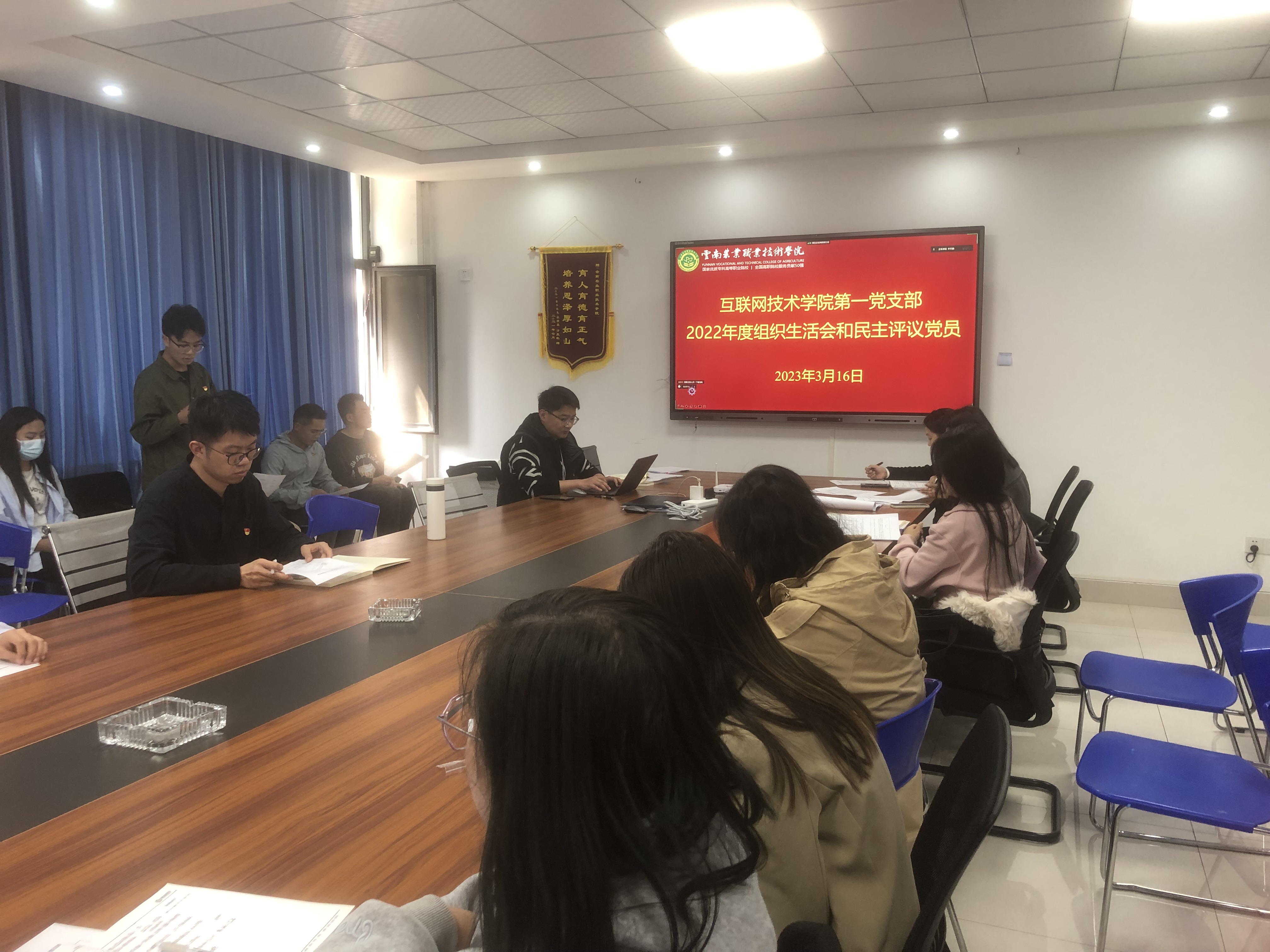 互联网技术学院第二党支部于 2023 年 3 月 15 日在农职培训中心704会议室召开组织生活会和民主评议党员。会议由党支部书记胡钦杰同志主持,学院组织部部长夏体韬同志、互联网技术学院党总支部纪检兼宣传委员马祖红同志到会督导。