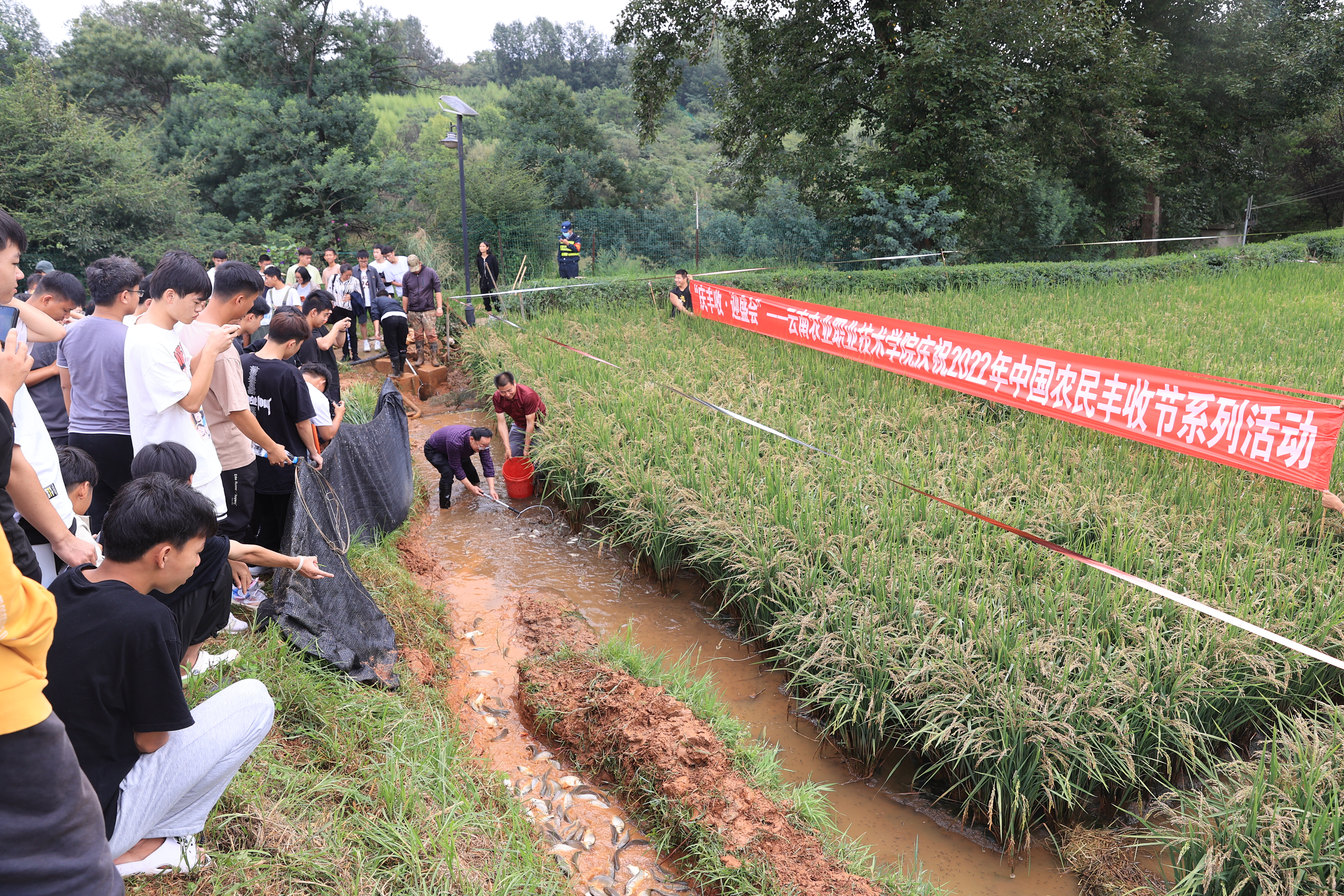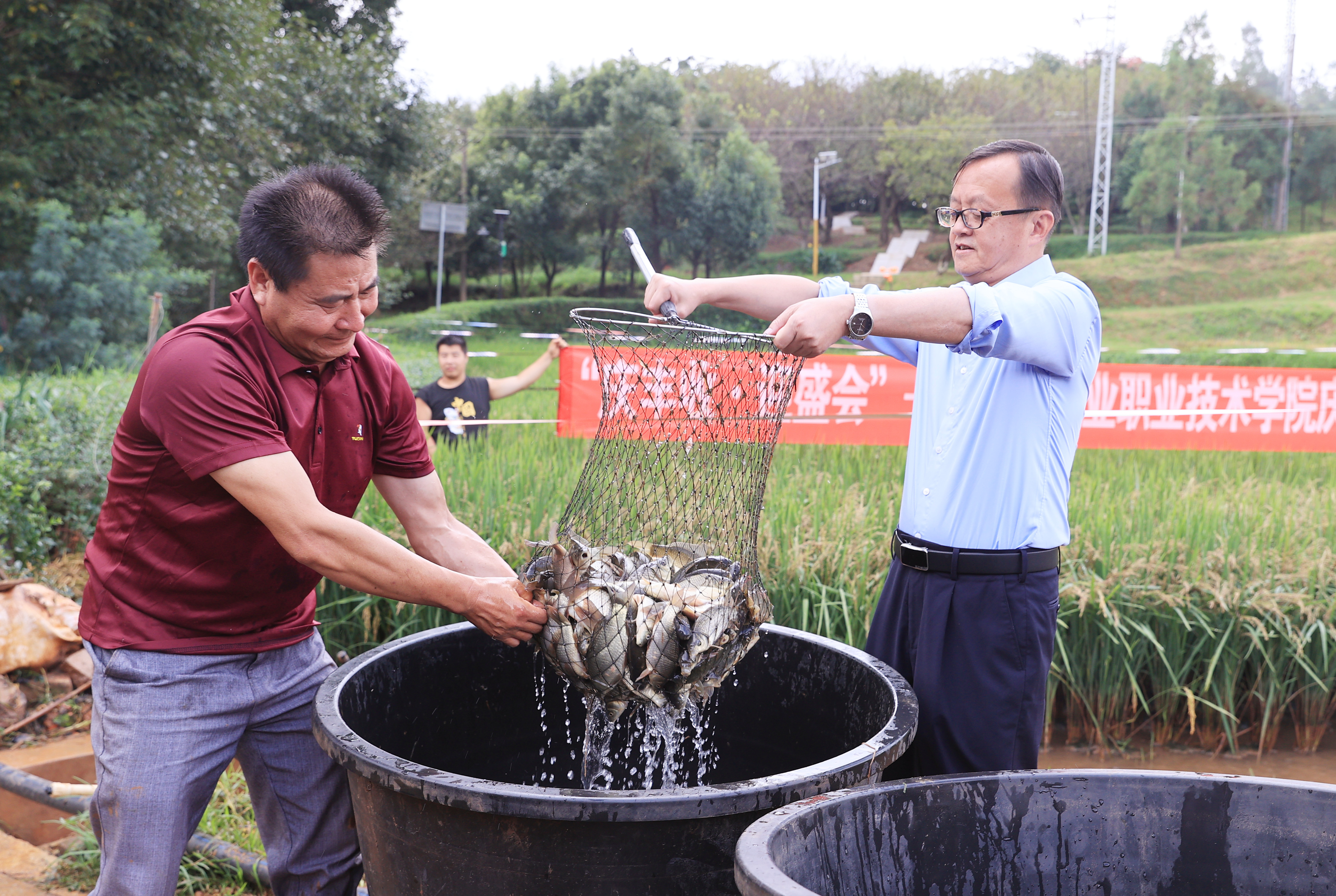 文俊书记充分肯定了学院在稻田养鱼方面取得的成绩,并宣布捕捞活动正式开始,师生们在欢声笑语中稻花田里捉鱼忙。