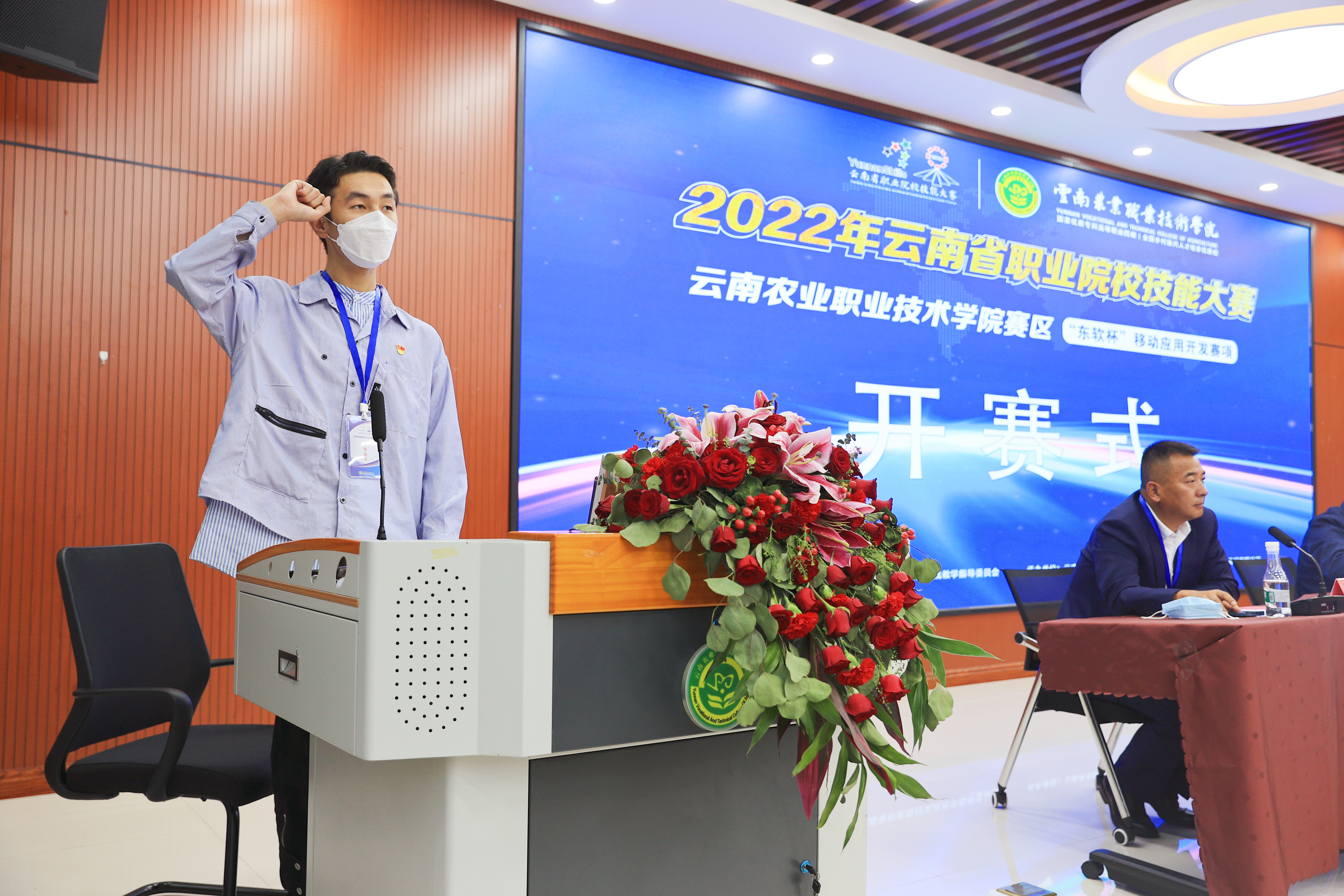 开赛式上,由湖南科技职业学院宋剑杰教授代表裁判员宣誓,我院参赛队员赵驰同学代表参赛选手宣誓。