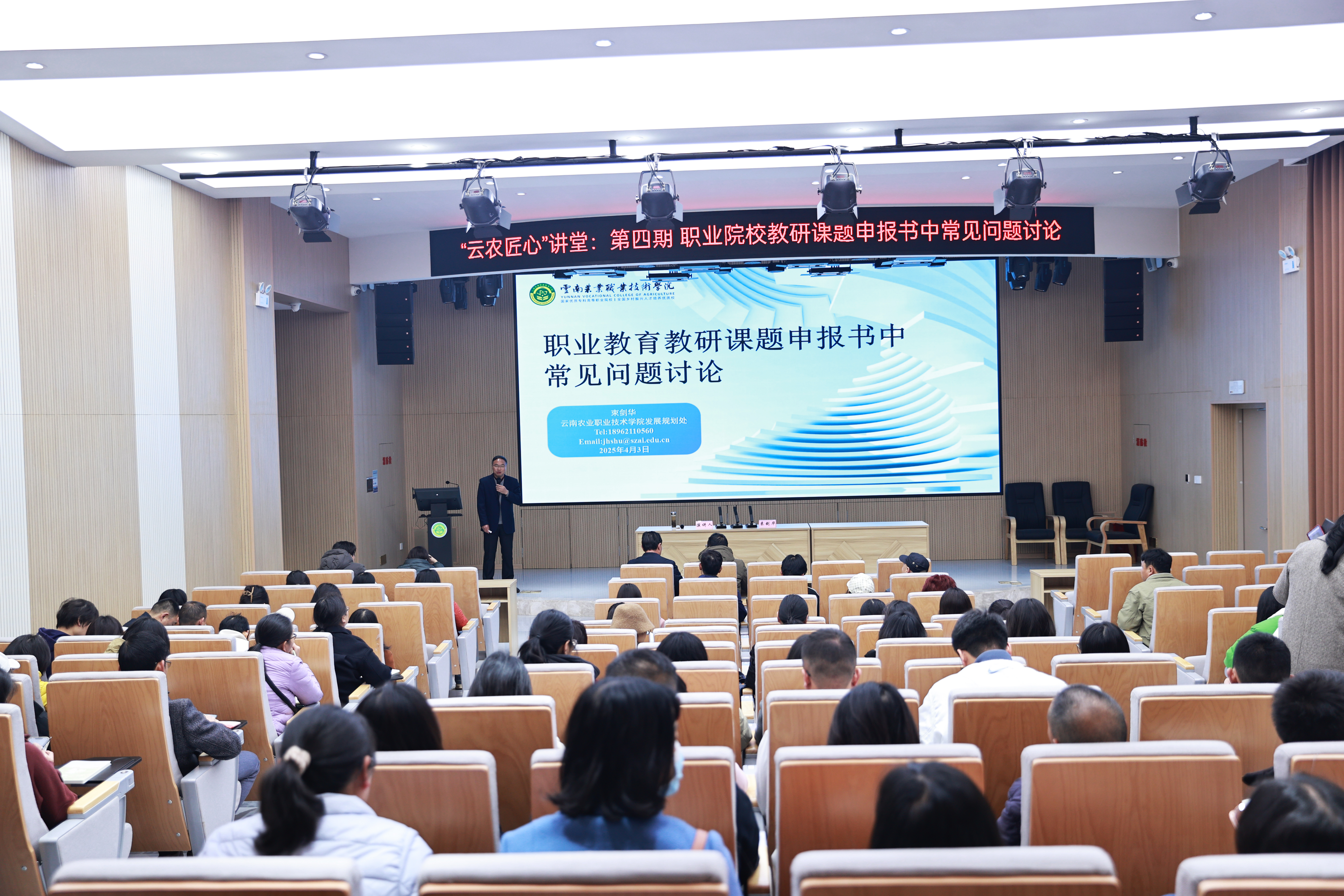 通知中心4月2日下午,学校“云农匠心讲堂”第四期在小哨校区综合楼一楼阶梯教室举行。国家级教学成果一等奖获得者,学校特聘教授、“银龄”教师束剑华教授以《职业院校教研课题申报书中常见问题讨论》为题,为学校教师带来了一场兼具理论深度与实践指导意义的学术报告。讲座聚焦课题申报核心环节的痛点难点,为提升教师教研能力提供了可操作性的解决方案。