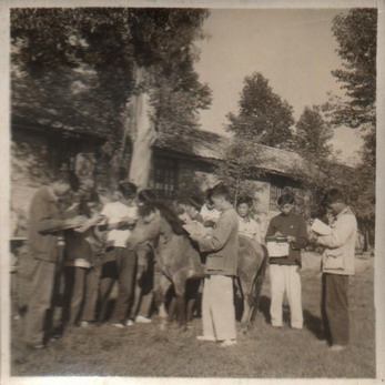 一匹五、六十年代的小马,被一群五、六十年代的兽医专业的孩子围着,静静地接受他们的研究。